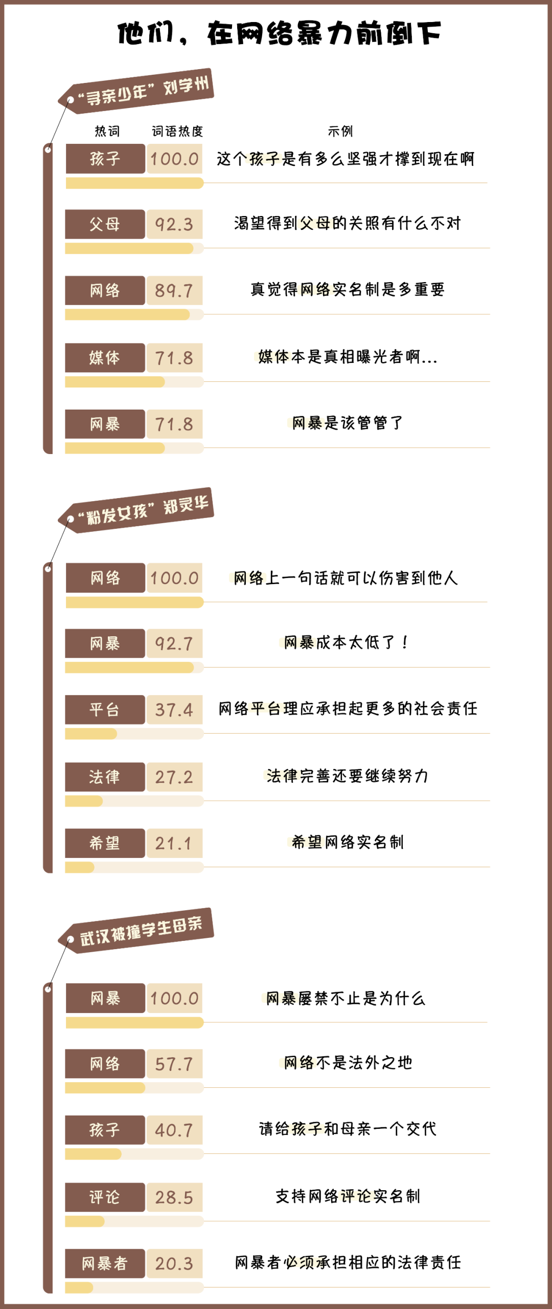 近年來,因網(wǎng)絡(luò)暴力導(dǎo)致的悲劇事件頻出,例如“尋親少年”劉學(xué)州因與親生父母親的矛盾遭受網(wǎng)絡(luò)暴力,最終選擇留下一封“來時(shí)即輕,還時(shí)亦凈”的遺書后自殺;“粉發(fā)女孩”鄭靈華因染粉色頭發(fā)被網(wǎng)暴導(dǎo)致嚴(yán)重抑郁,抗?fàn)師o果后選擇結(jié)束自己的生命;武漢被撞致死小學(xué)生的母親從高樓一躍而下,去世前曾遭遇惡意評論。