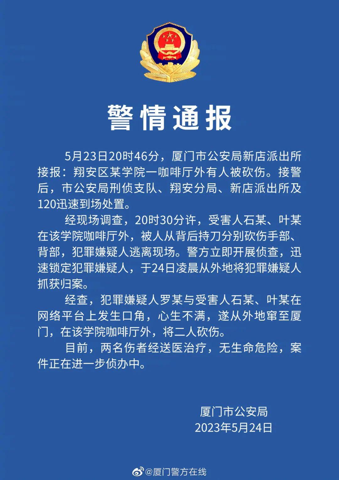 5月24日0時(shí)許,頂端新聞?dòng)浾呗?lián)系到廈門市翔安區(qū)新店派出所及翔安區(qū)公安局,相關(guān)工作人員均表示,警方已經(jīng)介入調(diào)查,后續(xù)會(huì)發(fā)布通報(bào)。當(dāng)日12時(shí)許,“@廈門警方在線”發(fā)布警情通報(bào)稱,5月23日20時(shí)30分許,受害人石某、葉某在某學(xué)院咖啡廳外,被人從背后持刀分別砍傷手部、背部。20時(shí)46分,廈門市公安局新店派出所接報(bào)立即開展偵查,于24日凌晨從外地將犯罪嫌疑人抓獲歸案。經(jīng)查,犯罪嫌疑人羅某與受害人石某、葉某在網(wǎng)絡(luò)平臺(tái)上發(fā)生口角,心生不滿,遂從外地竄至廈門實(shí)施作案。目前,兩名傷者經(jīng)送醫(yī)治療,無生命危險(xiǎn),案件正在進(jìn)一步偵辦中。