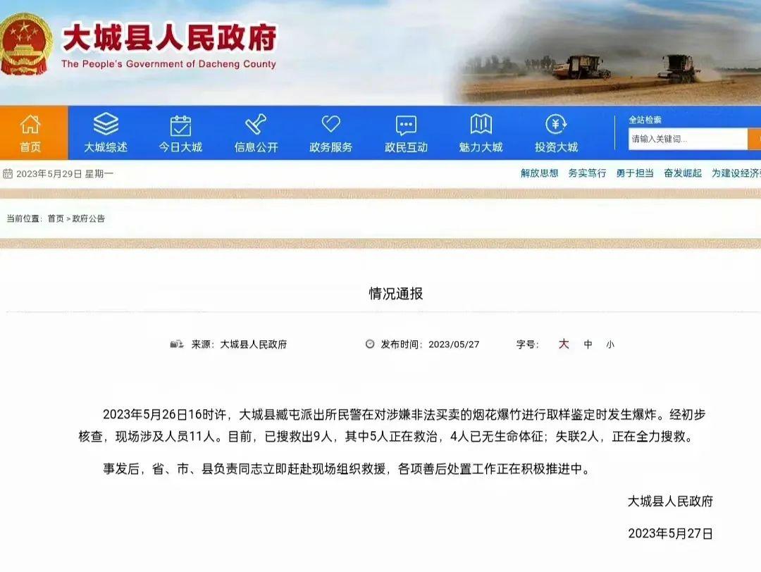5月26日下午,網(wǎng)傳河北大城縣一派出所院內(nèi)發(fā)生爆炸,事故原因引發(fā)網(wǎng)民追問(wèn)。5月27日8時(shí)許,大城縣人民政府網(wǎng)站通報(bào)稱(chēng):“5月26日16時(shí)許,大城縣臧屯派出所民警在對(duì)涉嫌非法買(mǎi)賣(mài)的煙花爆竹進(jìn)行取樣鑒定時(shí)發(fā)生爆炸。經(jīng)初步核查,現(xiàn)場(chǎng)涉及人員11人。其中,4人已無(wú)生命體征,失聯(lián)2人。”然而,通報(bào)中提及的爆炸原因卻成為后續(xù)輿情發(fā)酵點(diǎn),網(wǎng)民不解派出所民警為何要去鑒定煙花爆竹,部分網(wǎng)民借機(jī)對(duì)死去民警進(jìn)行冷嘲熱諷,發(fā)布揣測(cè)性信息,并獲得其他網(wǎng)民點(diǎn)贊。面對(duì)這種局面,當(dāng)?shù)卣⑽催M(jìn)行回應(yīng)和解釋?zhuān)J(rèn)證為“河北省公安廳政治部副主任”的賬號(hào)“@永華的小菜園”批評(píng)當(dāng)?shù)氐男畔l(fā)布“語(yǔ)焉不詳導(dǎo)致誤讀”。
