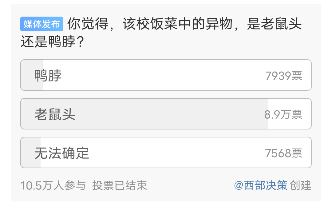 大量網(wǎng)民質(zhì)疑當?shù)叵嚓P(guān)部門“指鼠為鴨”。據(jù)“@西部決策”發(fā)起的一項超10萬人參與的微博投票顯示,近九成網(wǎng)民認為食堂中的異物為“鼠頭”,不少科普博主、微博大V還有媒體均就此事發(fā)表評論,輿論場基調(diào)以追問和批評為主。6月6日上午,微博話題“#長牙的鴨脖令人如鯁在喉#”沖上熱搜榜第一位。另據(jù)《河南商報》報道,有網(wǎng)民爆料該校一教職工疑似要求學(xué)生針對此事進行“控評”。輿論場上,除了批評校方說謊、隱瞞等聲音之外,還有網(wǎng)民疑惑市場監(jiān)管部門為何替學(xué)校“站臺”,猜測背后存在利益輸送等問題;也有網(wǎng)民拍攝視頻解釋稱,鴨脖在某個角度看起來很像老鼠頭;更多網(wǎng)民呼吁當?shù)乇O(jiān)管部門拿出更多檢測證據(jù)來。