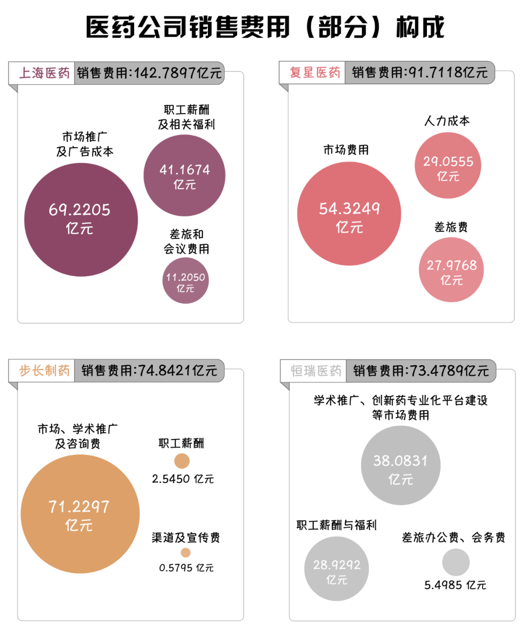 從藥企的銷售費(fèi)用構(gòu)成來看,分析2022年行業(yè)內(nèi)銷售費(fèi)用前4名的藥企可以看出,銷售費(fèi)用多用于市場、學(xué)術(shù)推廣、職工薪酬及福利。