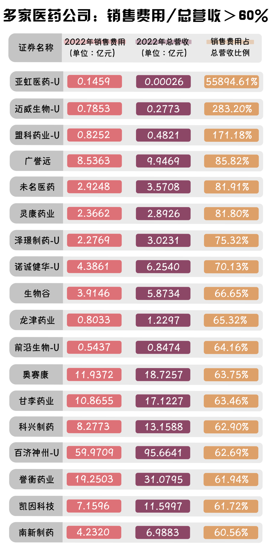 根據(jù)wind發(fā)布的數(shù)據(jù)顯示,從各藥企銷售費(fèi)用占總營收比例來看,截至2022年底,共18家藥企的銷售費(fèi)用占總營收比例超過60%,其中亞虹醫(yī)藥-U、邁威生物-U以及盟科藥業(yè)-U這三家藥企的銷售費(fèi)用占總營收比例均超過了100%。