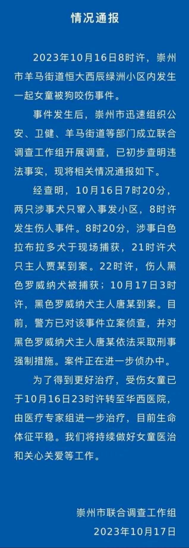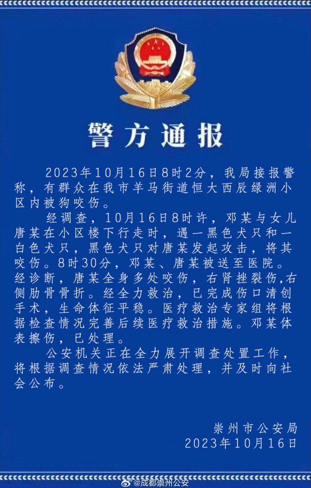 事發(fā)當(dāng)日17時(shí)許,崇州公安發(fā)布首份通報(bào),稱被咬女童生命體征平穩(wěn),正全力展開(kāi)調(diào)查處置工作。輿論場(chǎng)中不少網(wǎng)民探究事發(fā)原因,認(rèn)為養(yǎng)犬規(guī)定落實(shí)不到位,導(dǎo)致遛狗不牽繩、飼養(yǎng)烈性犬等亂象出現(xiàn)。10月17日,據(jù)受傷女童母親透露,涉事黑犬已被找到,警方還在排查狗主人。另有媒體報(bào)道稱,成都禁養(yǎng)22種烈性犬不包括羅威納,部分網(wǎng)民對(duì)警方工作效率表達(dá)不滿情緒。
