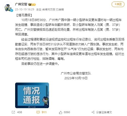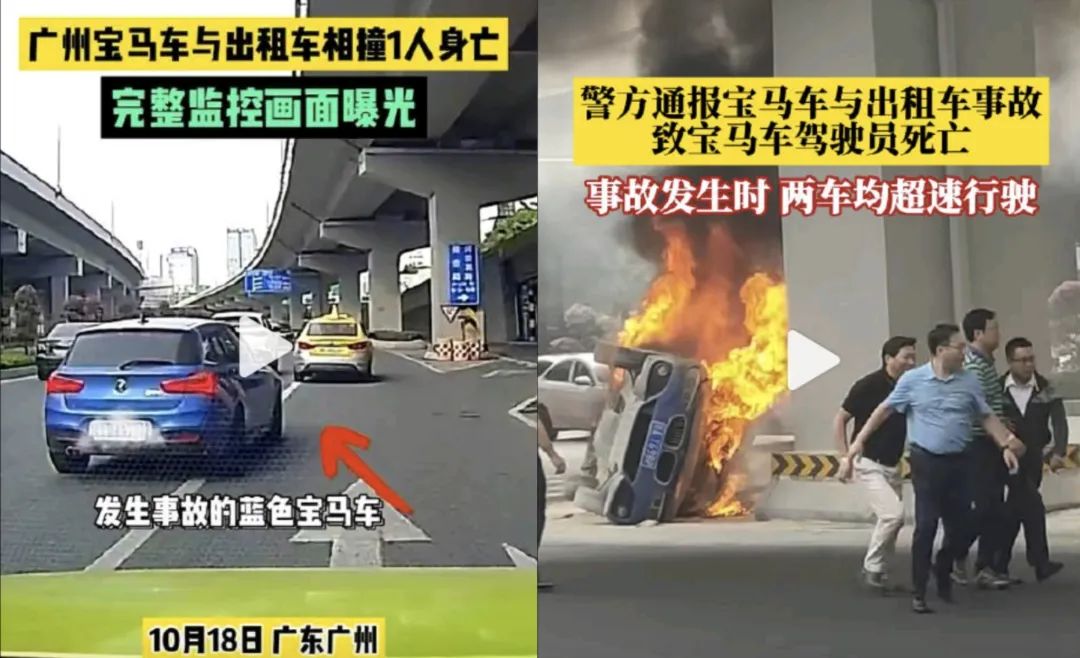 10月18日早高峰,廣州市廣園中路發(fā)生一起交通事故。事發(fā)一小時(shí)后,“@廣州交警”發(fā)布情況通報(bào)稱系兩輛小汽車碰撞導(dǎo)致其中一輛小汽車側(cè)翻后自燃的交通事故。之后,多段與事故相關(guān)的行車記錄儀視頻在網(wǎng)絡(luò)快速傳播。視頻中,藍(lán)色寶馬車在密集車流中連續(xù)加速變道并靠近出租車,之后強(qiáng)行變道以致事故發(fā)生。由于現(xiàn)場(chǎng)視頻沖擊力較強(qiáng),引發(fā)網(wǎng)民熱議,部分網(wǎng)民猜測(cè)寶馬車和出租車在相撞前存在“斗氣”行為。還有網(wǎng)民根據(jù)視頻指出兩車速度過(guò)快,疑似超速行駛。