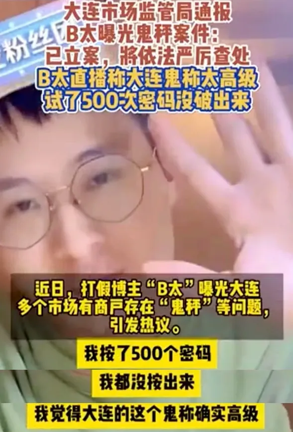 11月9日,“B太”發(fā)布實(shí)測海鮮加工餐廳的視頻,稱其到訪的3家海鮮加工商家均疑似在秤上做了手腳?!癇太”嘗試破解商家使用的“鬼秤”密碼時(shí),被商家推搡,還遭威脅“把眼鏡給你砸了”;其撥打市場監(jiān)管局電話后,等待一個(gè)半小時(shí)仍無人到場,直到“B太”開啟直播,工作人員才姍姍來遲?!癇太”出示相關(guān)視頻證據(jù),經(jīng)檢查該商家的電子秤雖然有強(qiáng)檢合格證,但沒有鉛封。而當(dāng)“鬼秤”被帶到市場監(jiān)管局時(shí),專業(yè)檢測人員只對“問題電子秤”進(jìn)行簡單檢測后就宣布該秤“無問題”。當(dāng)“B太”提出對電子秤進(jìn)行密碼破譯時(shí),檢測人員表示“我也跟著學(xué)習(xí)學(xué)習(xí)”,但“B太”嘗試了500多個(gè)密碼都未破解成功。次日,該電子秤被送往無錫檢測?!癇太”在微博和抖音平臺(tái)發(fā)布相關(guān)視頻,播放量迅速破億次,多數(shù)網(wǎng)民指責(zé)店家有恃無恐,質(zhì)疑市場監(jiān)管部門消極怠工;部分計(jì)劃去大連旅游的網(wǎng)民還表示,因擔(dān)心被“坑”將臨時(shí)改變目的地。
