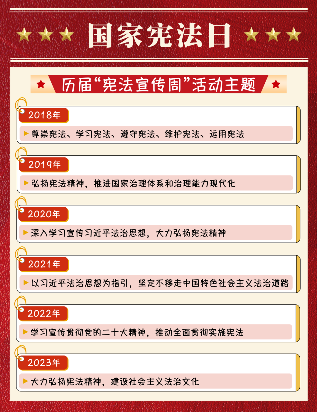 2023年12月4日是第十個(gè)國(guó)家憲法日,12月1日至7日是第六個(gè)“憲法宣傳周”,主題是“大力弘揚(yáng)憲法精神,建設(shè)社會(huì)主義法治文化”。