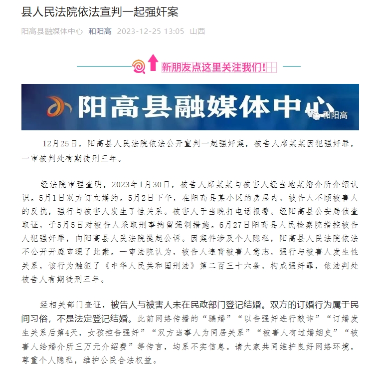 2023年12月25日13時(shí)許,陽(yáng)高縣融媒體中心微信公眾號(hào)“和陽(yáng)高”通報(bào)此案審理情況。通報(bào)指出,經(jīng)法院審理查明,2023年1月30日,被告人與被害人經(jīng)當(dāng)?shù)啬郴榻樗榻B認(rèn)識(shí)。5月1日雙方訂立婚約。5月2日下午,在陽(yáng)高縣某小區(qū)的房屋內(nèi),被告人不顧被害人反抗,強(qiáng)行與被害人發(fā)生了性關(guān)系。被害人于當(dāng)晚打電話報(bào)警。經(jīng)陽(yáng)高縣公安局偵查取證,于5月5日對(duì)被告人采取刑事拘留強(qiáng)制措施。經(jīng)相關(guān)部門(mén)查證,被告人與被害人未在民政部門(mén)登記結(jié)婚。雙方的訂婚行為屬于民間習(xí)俗,不是法定登記結(jié)婚。此前,此前網(wǎng)絡(luò)傳播的“騙婚”“以告強(qiáng)奸進(jìn)行敲詐”等多個(gè)傳言,均系不實(shí)信息。這一通報(bào)初步回應(yīng)了多個(gè)輿論關(guān)切點(diǎn),網(wǎng)民觀點(diǎn)開(kāi)始出現(xiàn)扭轉(zhuǎn),部分網(wǎng)民指出訂婚不等于同意發(fā)生性關(guān)系。