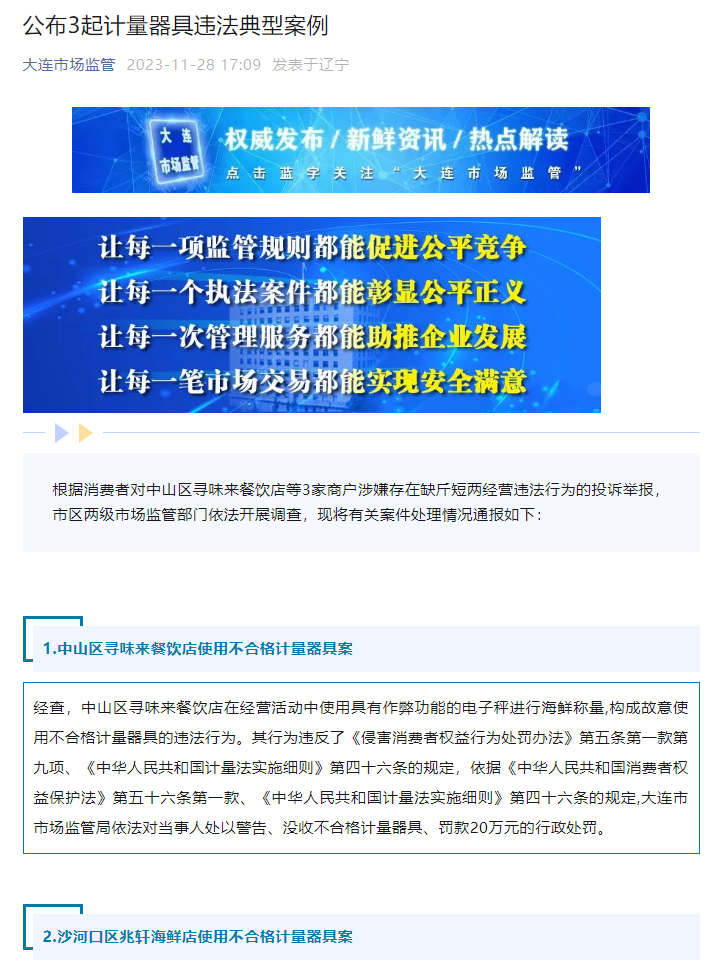 11月28日,微信公眾號“大連市場監(jiān)管”發(fā)布情況通報稱,根據(jù)消費者對3家商戶涉嫌缺斤短兩經(jīng)營的投訴舉報,市區(qū)兩級市場監(jiān)管部門依法開展調(diào)查,現(xiàn)將對中山區(qū)尋味來餐飲店、沙河口區(qū)福之源生鮮超市、沙河口區(qū)兆軒海鮮店分別處以20萬元、10萬元、10萬元的行政處罰,警告并沒收不合格計量器具。