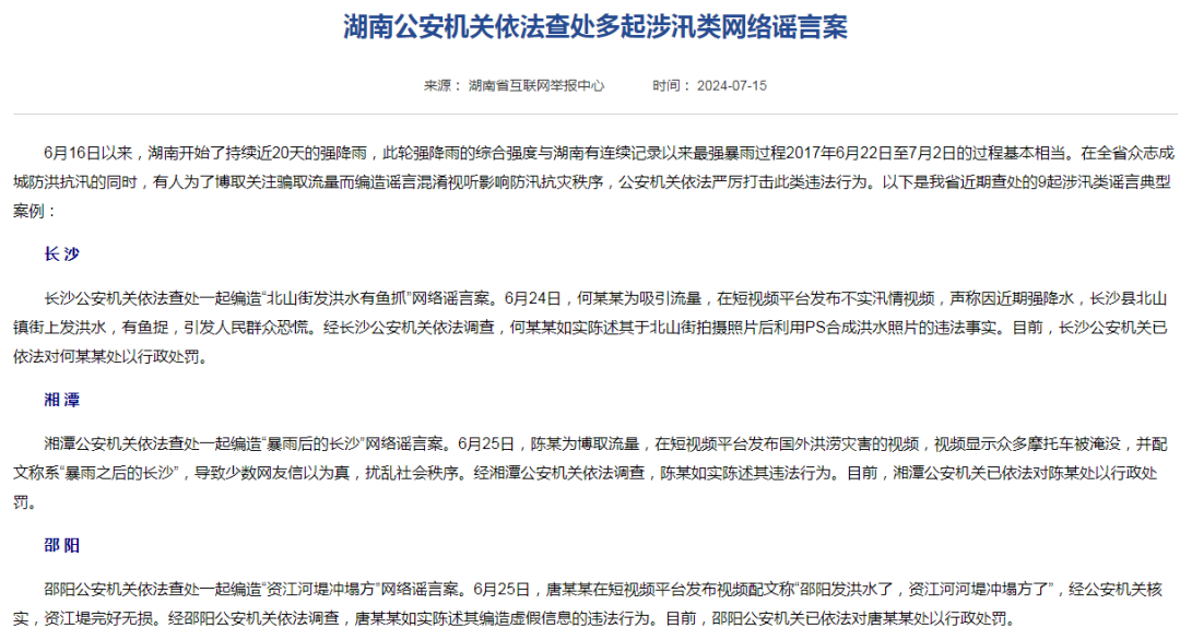二是夸大災情險情。此類謠言主要通過捏造數(shù)據(jù)、刻畫細節(jié)、綁架“官方”等伎倆,夸大災情險情,增強謠言的“可信度”。較為常見的是利用聳人聽聞的傷亡數(shù)據(jù)捏造受災嚴重的假象,招致人心惶惶。如湖南暴雨期間,常德市一網(wǎng)民在短視頻平臺發(fā)布居住地附近漲水視頻,編造稱“俺這里天天下雨,天天死人,半個月,三四十個人”,瀏覽量迅速破10萬次,遭到行政處罰;平江縣一網(wǎng)民在微信平臺造謠稱“很多尸體隨汨羅江被沖走,3萬多人不見了”被行政拘留。四川暴雨期間,曾某某在抖音平臺編造“達州洪災致4人死亡1人失聯(lián)”虛假信息被行政處罰等。再者,謠言詳細說明災害時間、地點及經(jīng)過等,給人一種如臨現(xiàn)場之感,難辨真假。如賬號“正能量實事說事”謊稱“岳陽市君山區(qū)許市鎮(zhèn)的堤防突然決口,洪水傾瀉而入,瞬間淹沒大片農(nóng)田和村莊,數(shù)千名群眾被洪水圍困,消防、武警等救援力量正展開緊急救援”。隨著文章在各大社交平臺擴散,恐慌情緒蔓延至線下,一些商家趁機哄抬物價,部分家庭甚至開始準備撤離。還有網(wǎng)民模仿權威發(fā)布,使用“嚴峻”“危急”等標題,煽動恐慌情緒。如廣西桂林遭遇超歷史紀錄洪水,抖音網(wǎng)民“土豆炒馬鈴薯”發(fā)布一則“情況緊急的新聞通知”造謠稱“接到上級電話,平樂縣新田水庫塌了”,引發(fā)不知情的網(wǎng)民留言追問情況。