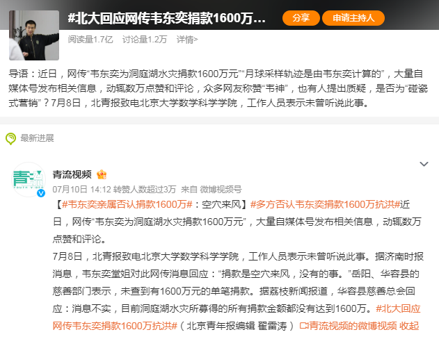 三是捏造救援救助信息。災害發(fā)生后,物資調撥、人員搜救、群眾轉移等搶險救援情況被主流媒體持續(xù)報道,吸引輿論廣泛關注,相關謠言趁機流竄,成為傳播主旋律中的雜音。如抖音網(wǎng)民“賓利xx”發(fā)視頻謊稱,河南南陽市臥龍區(qū)陸營鎮(zhèn)王莊村被水淹,臥龍區(qū)使用直升機進行救援。經(jīng)核實,“直升機救援”一說系虛假信息。網(wǎng)傳“韋東奕(韋神)為洞庭湖水災捐款1600萬元”消息引發(fā)關注,多個相關視頻獲得數(shù)萬點贊。事后,韋東奕親屬回應稱系“假消息”,湖南岳陽市和華容縣慈善部門也表示,未查到有1600萬元的單筆捐款。自媒體這種無底線的“碰瓷式營銷”激起輿論公憤,《新華每日電訊》發(fā)文稱,世上沒有所謂的“正能量謠言”,旗幟鮮明地打擊各類謠言,鏟除造謠傳謠的土壤,才是真正的正能量。《北京晚報》刊文評論稱,給“韋神”貼金是假,靠造謠撈金是真,任短視頻謠言隔三岔五污染視聽,會對整個社會信任體系造成沖擊。