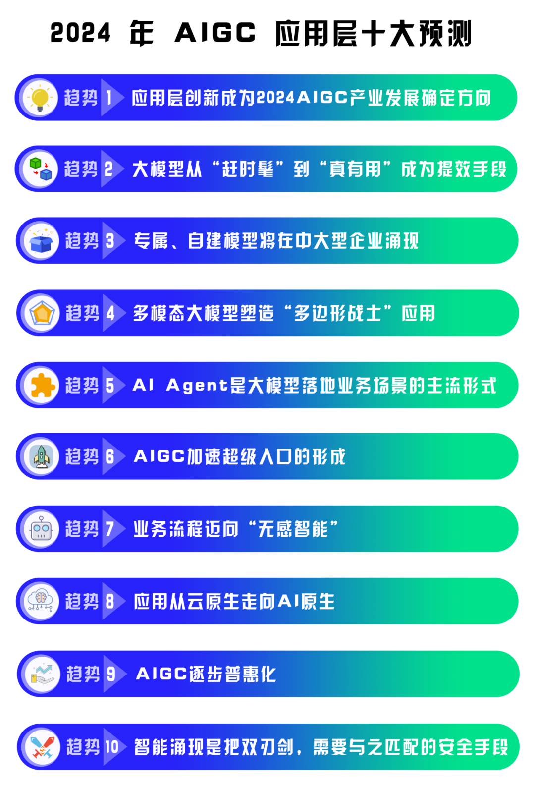《2024 AIGC應(yīng)用層十大趨勢白皮書》中列舉了2024年生成式人工智能應(yīng)用層十大預(yù)測,除了對生成式人工智能產(chǎn)業(yè)發(fā)展及應(yīng)用場景的預(yù)測外,還提到了“智能涌現(xiàn)是把雙刃劍,需要與之匹配的安全措施”。