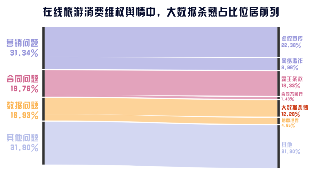 在超過(guò)10%在線(xiàn)旅游消費(fèi)輿情問(wèn)題比例的4個(gè)方面中,大數(shù)據(jù)殺熟(12.28%)赫然在列,其存在于傳統(tǒng)平臺(tái)的同時(shí),也向新型平臺(tái)“延伸”。