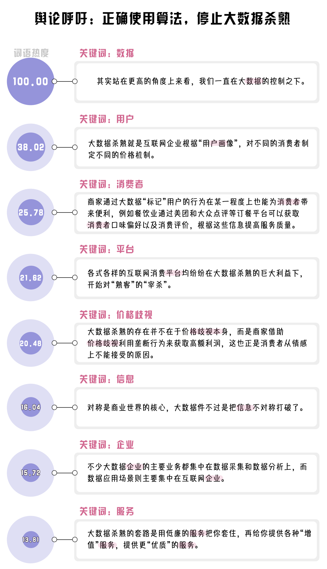 (制作:法治網(wǎng)輿情中心 數(shù)據(jù)來(lái)源:選取知乎問(wèn)題“如何評(píng)價(jià)大數(shù)據(jù)殺熟這一現(xiàn)象?”下的1090個(gè)回答,對(duì)選取的回答進(jìn)行數(shù)據(jù)清洗及自然語(yǔ)言處理,將熱度最高的詞語(yǔ)規(guī)定為100)