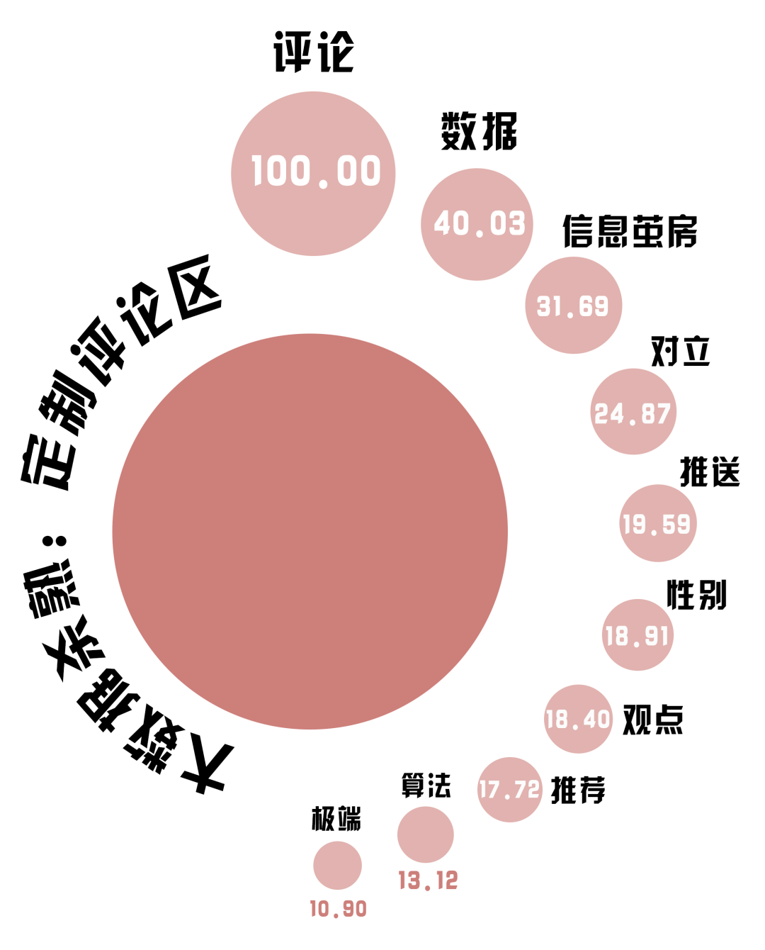 (制作:法治網(wǎng)輿情中心 數(shù)據(jù)來(lái)源:收集嗶哩嗶哩《大數(shù)據(jù)殺熟,評(píng)論區(qū)定制化有多恐怖?》下的2269條一級(jí)評(píng)論,對(duì)選取的回答進(jìn)行數(shù)據(jù)清洗及自然語(yǔ)言處理,將熱度最高的詞語(yǔ)規(guī)定為100)