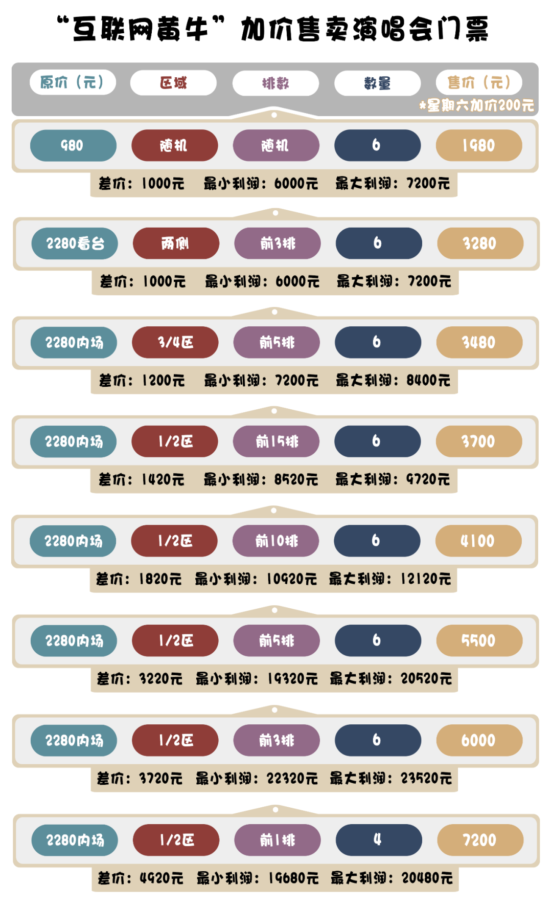 盡管如此,對(duì)于背后有二級(jí)資源的“互聯(lián)網(wǎng)黃?!眮?lái)說(shuō),售賣(mài)“黃?!逼辈⒉皇请y事。以某位在廣東地區(qū)深受歡迎的歌手為例,其預(yù)計(jì)在今年11月舉行多場(chǎng)個(gè)人演唱會(huì),但有粉絲表示,演唱會(huì)的門(mén)票仍“一秒售罄”。某二手置物平臺(tái)數(shù)據(jù)顯示,演唱會(huì)門(mén)票并非全部售空,部分門(mén)票流入“互聯(lián)網(wǎng)黃牛”之手,原價(jià)為2280元的內(nèi)場(chǎng)票,因位置不同被炒至3280元至7200元不等。此外,若趕上演唱會(huì)在星期六舉辦,買(mǎi)家還需要額外支付200元的“熱門(mén)時(shí)段搶票費(fèi)用”。面對(duì)“一人一證”的入場(chǎng)機(jī)制,“互聯(lián)網(wǎng)黃?!钡纳馑坪醪⑽词艿接绊?。