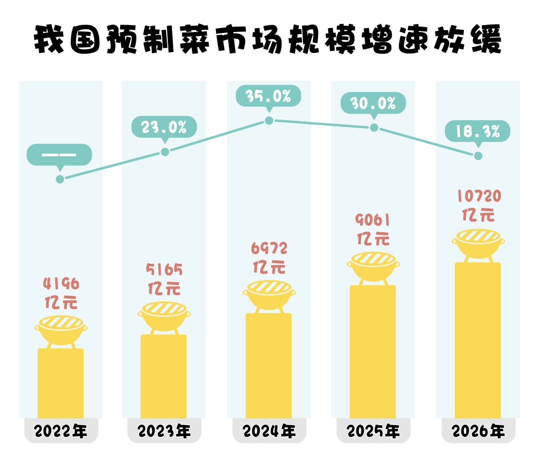 從艾媒咨詢發(fā)布的數(shù)據(jù)來看,我國(guó)預(yù)制菜市場(chǎng)規(guī)模呈逐年擴(kuò)張趨勢(shì),并有望在2026年突破10720億元,但是預(yù)制菜市場(chǎng)規(guī)模增速卻在逐步放緩。2024年,我國(guó)預(yù)制菜市場(chǎng)規(guī)模同比增長(zhǎng)率為35%,而這一數(shù)字預(yù)計(jì)在2026年跌至18.3%。