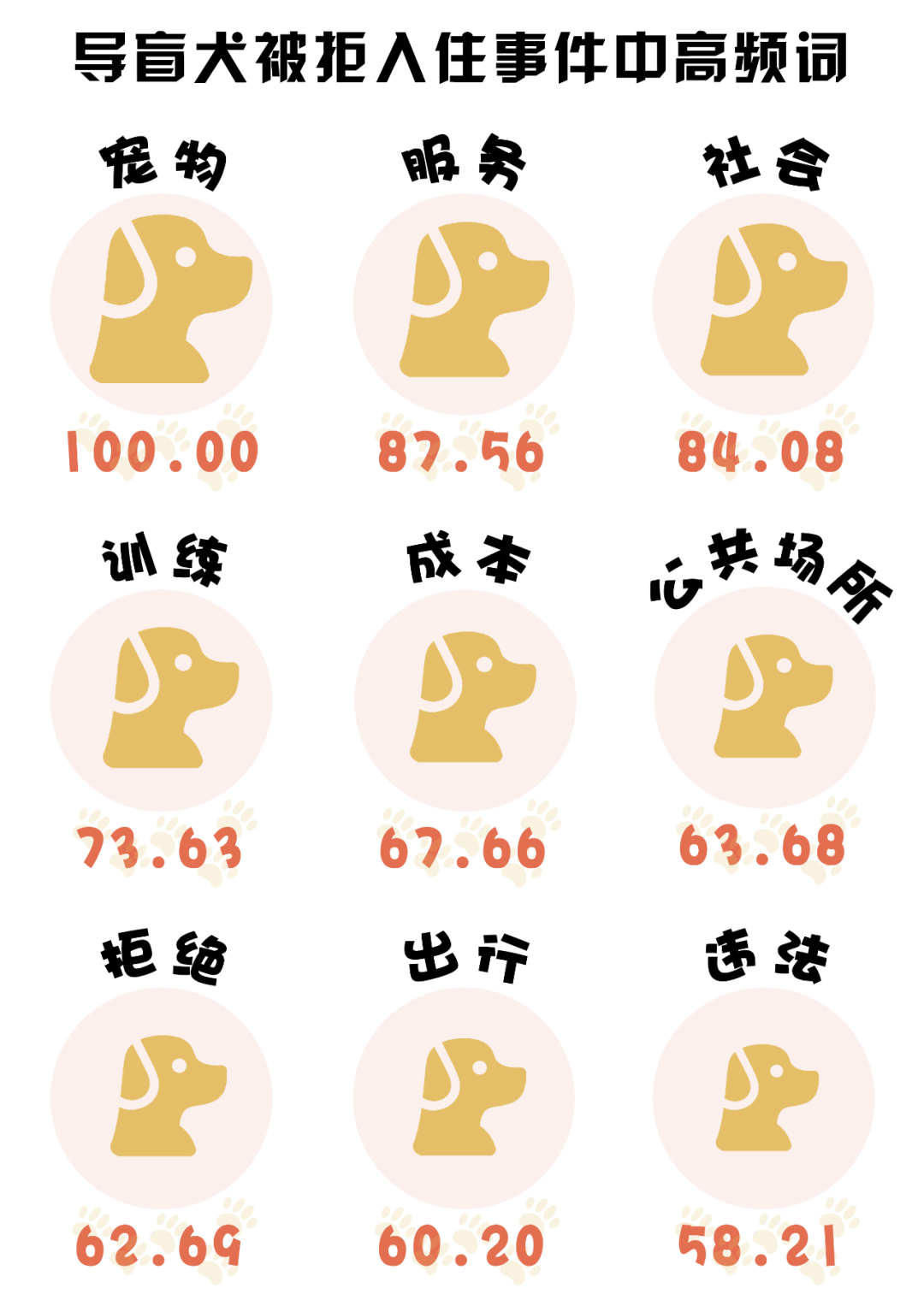 (數(shù)據(jù)來源:選取嗶哩嗶哩視頻《炒作、稀缺、奢侈品?為什么導盲犬被噴成了一場騙局?》下的6949條一級評論及彈幕,做分詞及歸一化處理,進行分詞后將熱度最高的詞語規(guī)定為100)
