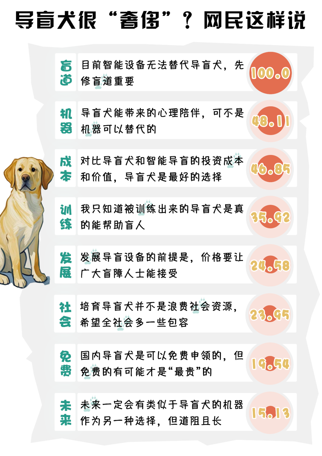 數(shù)據(jù)顯示,培訓一條導盲犬的成本約20萬元,有人戲稱其是“奢侈品”。其實,導盲犬是免費給視障人士使用的,其養(yǎng)護、醫(yī)療等成本與寵物犬相差并不大。輿論場中,網(wǎng)民對于導盲犬的價值討論呈現(xiàn)截然不同看法。