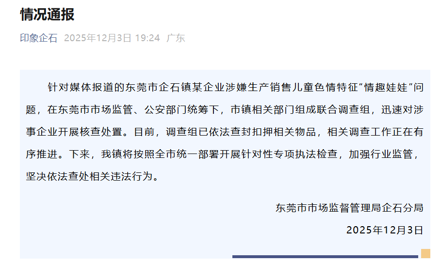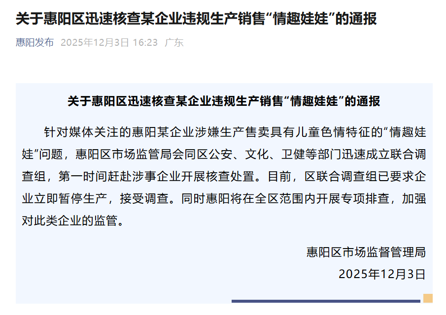 12月3日上午,廣東惠州惠陽區(qū)市場監(jiān)督管理局一名工作人員表示,針對報道披露的事件,惠陽區(qū)相關(guān)領(lǐng)導(dǎo)高度重視,已召集多部門進行聯(lián)合研判。3日下午,惠陽區(qū)市場監(jiān)督管理局發(fā)布情況通報,已會同區(qū)公安、文化、衛(wèi)健等部門迅速成立聯(lián)合調(diào)查組,要求企業(yè)立即暫停生產(chǎn),接受調(diào)查,同時將在全區(qū)范圍內(nèi)開展專項排查。3日下午,上海市奉賢區(qū)市場監(jiān)督管理局一名工作人員表示,針對此事,正在調(diào)查中。3日晚間,東莞市市場監(jiān)督管理局企石分局通報稱,在東莞市市場監(jiān)管、公安部門統(tǒng)籌下,市鎮(zhèn)相關(guān)部門組成聯(lián)合調(diào)查組,目前已依法查封扣押相關(guān)物品,接下來將按照全市統(tǒng)一部署開展針對性專項執(zhí)法檢查。