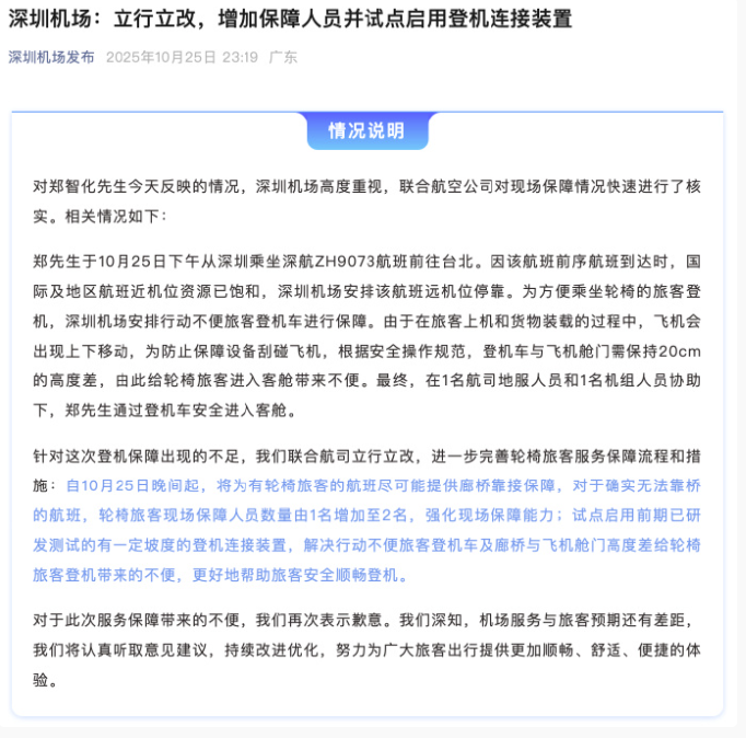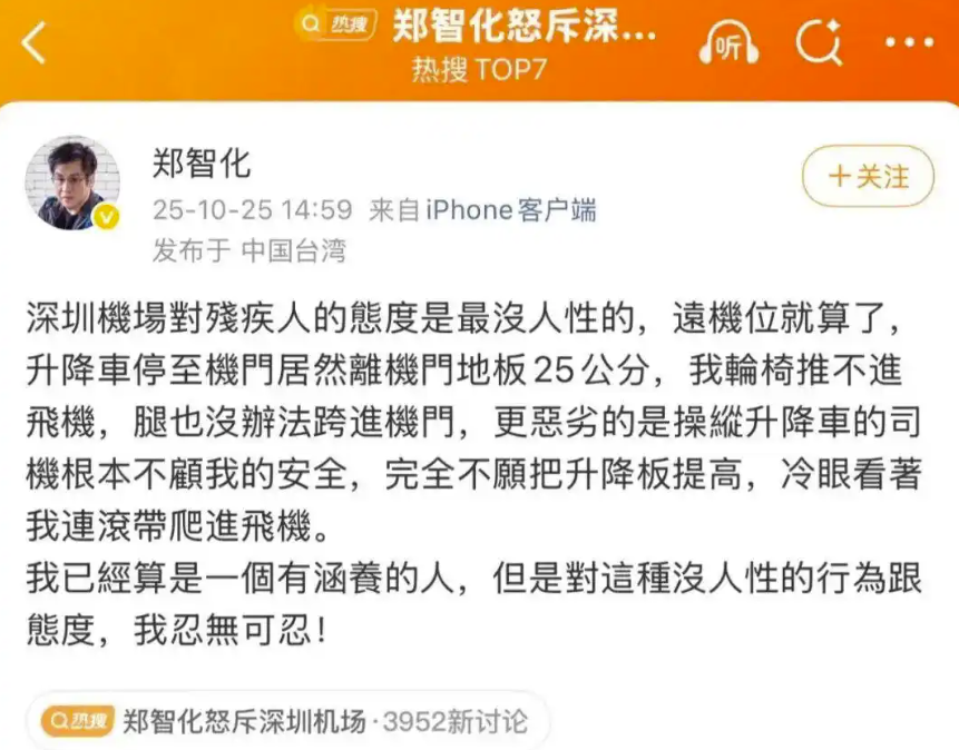 10月25日14時(shí)59分,中國臺灣歌手鄭智化通過微博賬號發(fā)文控訴其在深圳機(jī)場遭遇“不人性”對待:“操縱升降車的司機(jī)根本不顧我的安全,完全不愿把升降板提高,冷眼看著我連滾帶爬進(jìn)飛機(jī)?!?小時(shí)后,相關(guān)話題出現(xiàn)在微博熱搜榜上,引發(fā)網(wǎng)民一致聲討涉事機(jī)場。當(dāng)日18時(shí)許,深圳機(jī)場在該微博評論區(qū)留言致歉,表示已啟動核查,將以此為契機(jī)優(yōu)化特殊旅客的服務(wù)保障細(xì)節(jié)。23時(shí)許,深圳機(jī)場通過微信公眾號再發(fā)情況說明,稱將進(jìn)一步完善廊橋靠接保障、人員增配等多項(xiàng)整改措施,更好幫助旅客安全順暢登機(jī)。