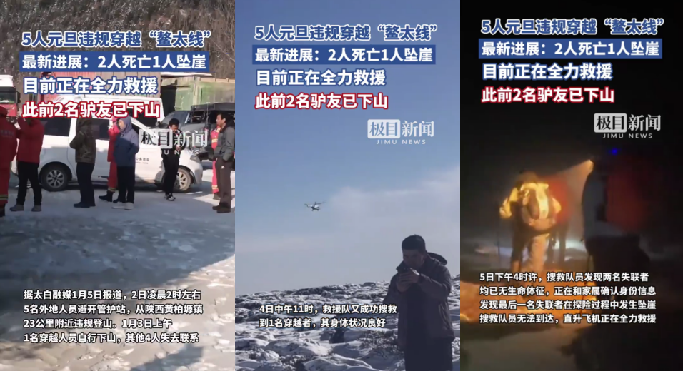 1月3日,有網(wǎng)民發(fā)帖稱“元旦期間5人穿越‘小鰲太線’,4人失聯(lián)”,引發(fā)關(guān)注。1月5日晚,“太白融媒”微信公眾號(hào)發(fā)布通報(bào)稱,1月2日凌晨2時(shí)左右,5名外地人員避開管護(hù)站,從黃柏塬鎮(zhèn)23公里附近違規(guī)登山。1月3日上午,1名穿越人員自行下山,其他4人失去聯(lián)系。當(dāng)?shù)仉S后組織救援人員進(jìn)山全力搜救。1月4日11時(shí),救援隊(duì)成功搜救到1人,其身體狀況良好。1月5日下午4時(shí)許,救援隊(duì)又發(fā)現(xiàn)2名失聯(lián)者,已無生命體征,同時(shí)發(fā)現(xiàn)最后1名失聯(lián)者在探險(xiǎn)過程中發(fā)生墜崖事故,現(xiàn)場坡陡崖高,搜救隊(duì)員無法到達(dá),出動(dòng)了直升機(jī)全力救援。