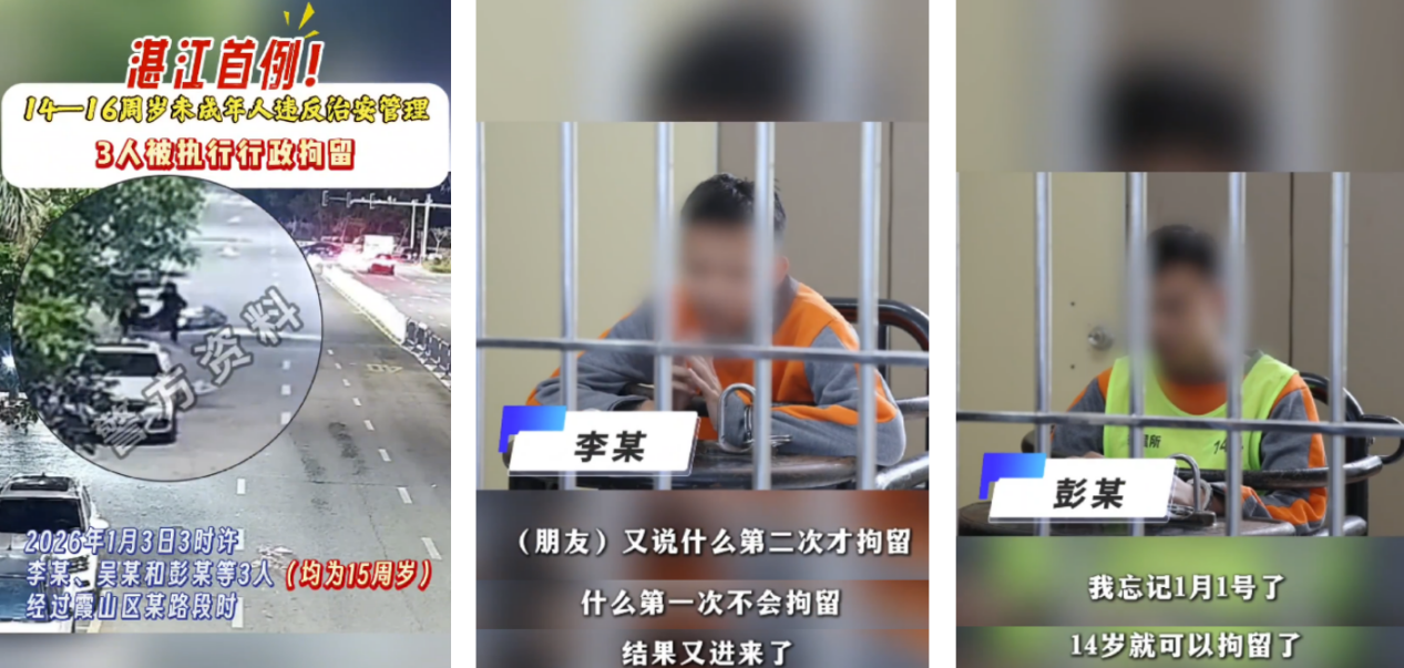 1月8日,《湛江晚報(bào)》報(bào)道稱,1月3日,廣東湛江3名15歲少年因持械追打他人涉嫌尋釁滋事,被依法行政拘留13天。這是2026年1月1日新修訂的《中華人民共和國治安管理處罰法》施行以來,該市首例對(duì)14至16周歲未成年人執(zhí)行行政拘留的案件。