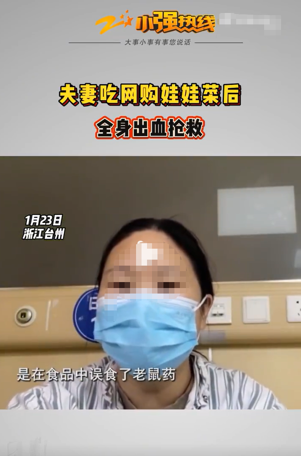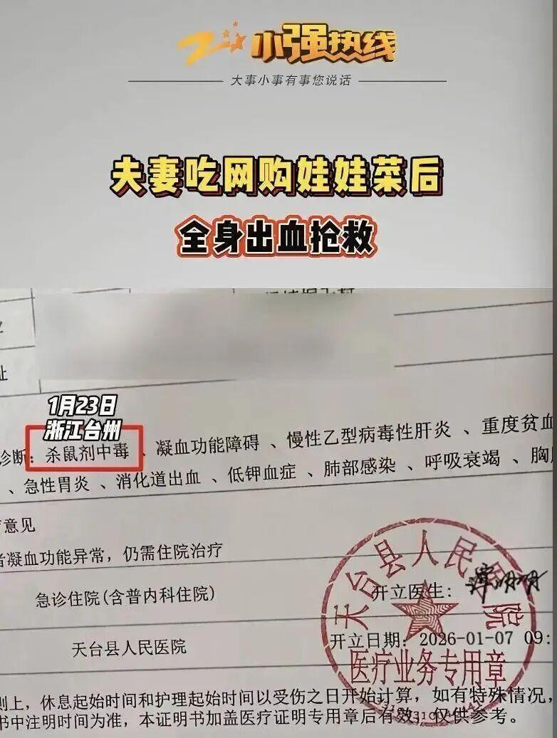 1月23日,浙江衛(wèi)視科教頻道小強(qiáng)熱線節(jié)目報(bào)道稱,浙江臺(tái)州天臺(tái)縣楊女士和丈夫于2025年12月網(wǎng)購(gòu)?fù)尥薏?,食用后夫婦倆同時(shí)出現(xiàn)全身出血癥狀,入院搶救。醫(yī)院診斷結(jié)果顯示,夫婦倆均為老鼠藥中毒。1月12日,夫婦倆選擇報(bào)警。警方檢測(cè)了楊女士家中物品,從娃娃菜中檢測(cè)出了老鼠藥。隨后,天臺(tái)縣公安局受理了楊女士夫婦報(bào)稱的“森逸軒花卉園藝生產(chǎn)、銷售有毒、有害食品案”。