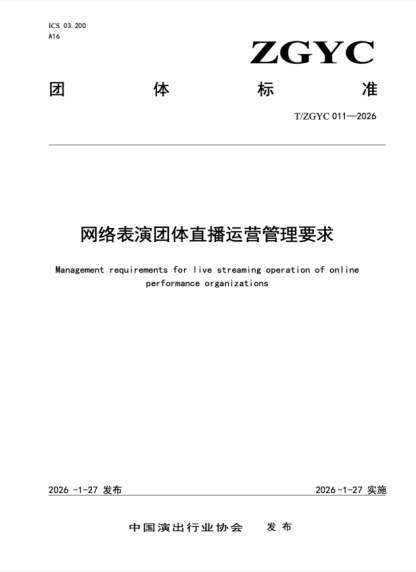 1月27日,中國演出行業(yè)協(xié)會(huì)正式發(fā)布《網(wǎng)絡(luò)表演團(tuán)體直播運(yùn)營管理要求》(T/ZGYC 011—2026)團(tuán)體標(biāo)準(zhǔn)(以下簡稱標(biāo)準(zhǔn)),抖音、快手、無憂傳媒等平臺(tái)及MCN機(jī)構(gòu)參與起草。