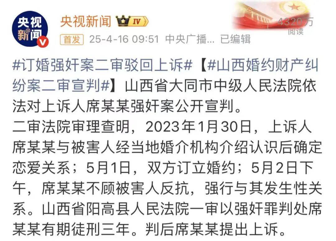 據(jù)澎湃新聞等媒體報道,2025年3月25日,山西大同“訂婚強奸案”當事人席某某強奸上訴案及涉婚約財產(chǎn)糾紛上訴案,在大同市中院不公開審理。庭審過程中,受害人和被告人雙方重點圍繞是否實質性發(fā)生關系、案件新證據(jù)證明力等問題展開辯論。4月2日,被告人席某某母親鄭某某前往大同市檢察院提交控訴材料,請求對陽高縣公安局和縣檢察院涉及本案的12名辦案人員以涉嫌程序違法、玩忽職守追究責任。4月16日,大同市中院二審公開宣判,裁定駁回上訴,維持原判,席某某因強奸罪被判處有期徒刑三年。同日,對于該案所涉的婚約財產(chǎn)糾紛案,二審法院駁回上訴、維持原判。法院宣判后,辦案法官通過“@人民日報”“@央視新聞”進行釋法解讀,圍繞席某某強奸罪名為何成立、認定強奸事實的主要證據(jù)、女方是否騙婚、為何沒有判處席某某緩刑、審判是否受到輿論影響等方面作出回應。5月14日,媒體報道稱,山西大同“訂婚強奸案”被列入人民法院案例庫,意味著該案例對類案審判具有示范價值,再次引發(fā)輿論熱議。