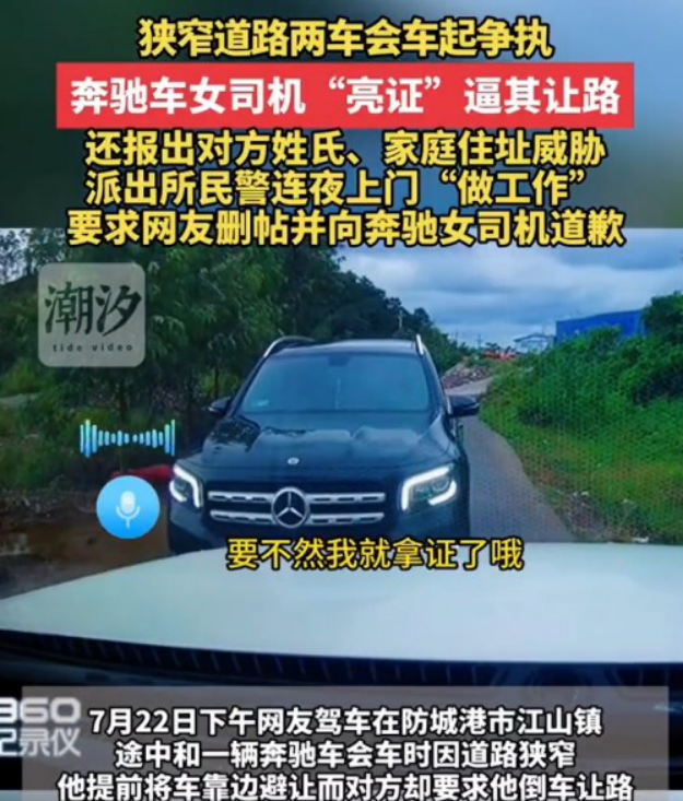2025年7月31日,抖音網(wǎng)民“吹雞平頭哥”發(fā)布視頻稱自己幾日前在廣西防城港市江山鎮(zhèn)與一奔馳車會車時(shí),女車主要求其倒車未果后,拿出印有“行政執(zhí)法”字樣的證件,該車同行男子還當(dāng)面報(bào)出其家庭住址等個(gè)人信息。視頻經(jīng)自媒體轉(zhuǎn)發(fā)后迅速引發(fā)輿論熱議。當(dāng)晚,當(dāng)?shù)嘏沙鏊窬c亮證車主前往曝光者老家,要求其刪帖致歉,輿情熱度登頂。面對媒體追問“駕車女子是否為公職人員”,當(dāng)?shù)嘏沙鏊凸簿志凑婊卮稹?月1日,防城港市公安局邊境管理支隊(duì)發(fā)布情況通報(bào),表示已成立工作組展開調(diào)查。同時(shí)網(wǎng)絡(luò)上開始流傳“亮證車主為公安部門某領(lǐng)導(dǎo)”的信息,該傳言隨即被公安和網(wǎng)信部門辟謠。8月3日,防城港市委、市政府調(diào)查組通報(bào)調(diào)查結(jié)果,稱亮證車主系一民營企業(yè)員工,因與曝光者父母為親戚關(guān)系,所以知道其個(gè)人信息;女車主所持證件為其丈夫侯某某的行政執(zhí)法證。8月5日,防城港市公安局防城分局發(fā)布公安行政處罰決定書,侯某某被行政拘留5日。8月16日,防城港市委、市政府調(diào)查組通報(bào)后續(xù)處理結(jié)果,侯某某丈夫被給予黨內(nèi)警告處分,多名公職人員被問責(zé)。