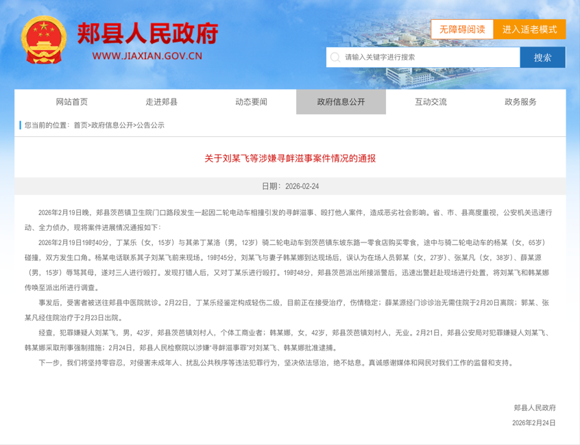 2月24日,平頂山市郟縣人民政府跟進發(fā)布詳細通報,稱劉某飛與妻子韓某娜到達現場后,誤認為在場人員郭某、張某凡、薛某源辱罵其母,遂對三人進行毆打。發(fā)現打錯人后,又對丁某樂進行毆打。通報確認被打女孩丁某樂傷情鑒定為輕傷二級,目前正在接受治療,三名勸架路人經診治均已離院。經查,犯罪嫌疑人劉某飛,男,42歲,郟縣茨芭鎮(zhèn)劉村人,個體工商業(yè)者;韓某娜,女,42歲,郟縣茨芭鎮(zhèn)劉村人,無業(yè)。24日,郟縣人民檢察院以涉嫌尋釁滋事罪對劉某飛、韓某娜批準逮捕。