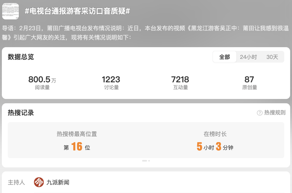 截至2月27日17時,相關(guān)信息量近3萬條,微博話題“#被質(zhì)疑采訪口音游客工作生活在福建#”“#電視臺通報游客采訪口音質(zhì)疑#”“#被質(zhì)疑口音當事游客爺爺為黑龍江人#”“#黑龍江游客張嘴卻是福建口音#”等閱讀量累計達1545萬。