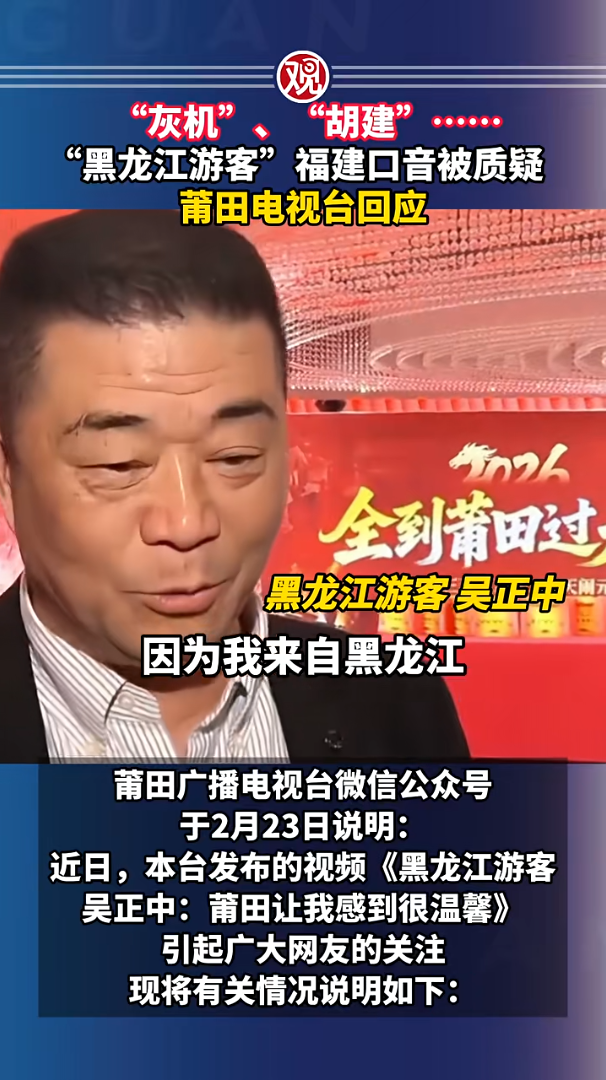 2月21日,福建莆田廣播電視臺為宣傳當?shù)亍叭狡翁镞^大年”新春文旅活動,發(fā)布了一則視頻《黑龍江游客吳正中:莆田讓我感到很溫馨》。視頻中吳正中自稱黑龍江游客,稱“專程坐飛機11小時來莆田過年”,并盛贊當?shù)睾ur和民俗。然而細心的網(wǎng)民發(fā)現(xiàn)其口音帶有典型的福建方言特征,如將“飛機”讀作“灰機”、“福建”讀作“胡建”,對其“東北人”的身份表示懷疑。
