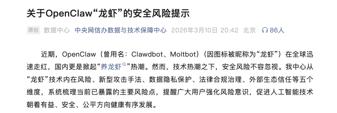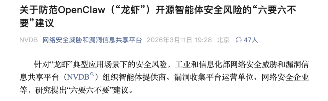 3月10日和11日,中央網(wǎng)信辦、工業(yè)和信息化部先后發(fā)布關(guān)于OpenClaw“龍蝦”的安全風(fēng)險(xiǎn)提示,從“龍蝦”技術(shù)內(nèi)在風(fēng)險(xiǎn)、新型攻擊手法、數(shù)據(jù)隱私保護(hù)、法律合規(guī)治理、外部生態(tài)信任等維度,系統(tǒng)梳理當(dāng)前已暴露的主要風(fēng)險(xiǎn)點(diǎn),并提出“六要六不要”的規(guī)范指引,提醒用戶(hù)強(qiáng)化風(fēng)險(xiǎn)意識(shí),引導(dǎo)人工智能技術(shù)安全、有序、健康發(fā)展。