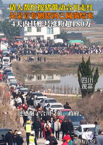 1月9日凌晨,來自重慶合川的抖音博主“呆呆”發(fā)視頻稱,1月11日家中要?dú)深^豬,因?yàn)楦改改挲g大了按不住,希望有人幫忙按豬,將請吃刨豬湯答謝,“呆呆”還開玩笑稱“就想家門口停滿車,在村里揚(yáng)眉吐氣一回”。短短兩日,視頻點(diǎn)贊量突破18萬,轉(zhuǎn)發(fā)量超14萬,“呆呆”建立的6個(gè)500人的“刨豬湯”群很快滿員。盡管“呆呆”連夜采購食材并報(bào)備派出所,但已無法阻止網(wǎng)民熱情。1月10日凌晨,合川文旅緊急抽調(diào)工作人員趕赴現(xiàn)場,協(xié)助保障活動順利進(jìn)行。1月11日,來自全國各地超4000名網(wǎng)民匯聚“呆呆”家鄉(xiāng),其中不乏“鹵鵝哥”等知名網(wǎng)紅。1月11日至12日,“呆呆”連開多場直播,邀請網(wǎng)民參加家鄉(xiāng)大聯(lián)歡,直播間觀看和點(diǎn)贊人數(shù)均超3000萬人次。在合川文旅、愛心企業(yè)、網(wǎng)民等多方贊助下,原計(jì)劃的兩頭豬增至五頭,現(xiàn)場設(shè)五個(gè)分會場分散人流,公安部門疏導(dǎo)交通。合川文旅部門帶著本地特產(chǎn)、景區(qū)門票到現(xiàn)場,講解“刨豬宴”和合川歷史文化,還設(shè)置篝火、煙花、舞龍等環(huán)節(jié)。據(jù)現(xiàn)場網(wǎng)民透露,當(dāng)?shù)匾还矓[了300桌宴席,最多時(shí)同時(shí)有超3000人。該事件引發(fā)熱烈討論,“殺豬女孩呆呆一天漲粉150萬”“呆呆殺豬宴一天蒸1000多斤大米”等多個(gè)話題沖上社交平臺熱搜。