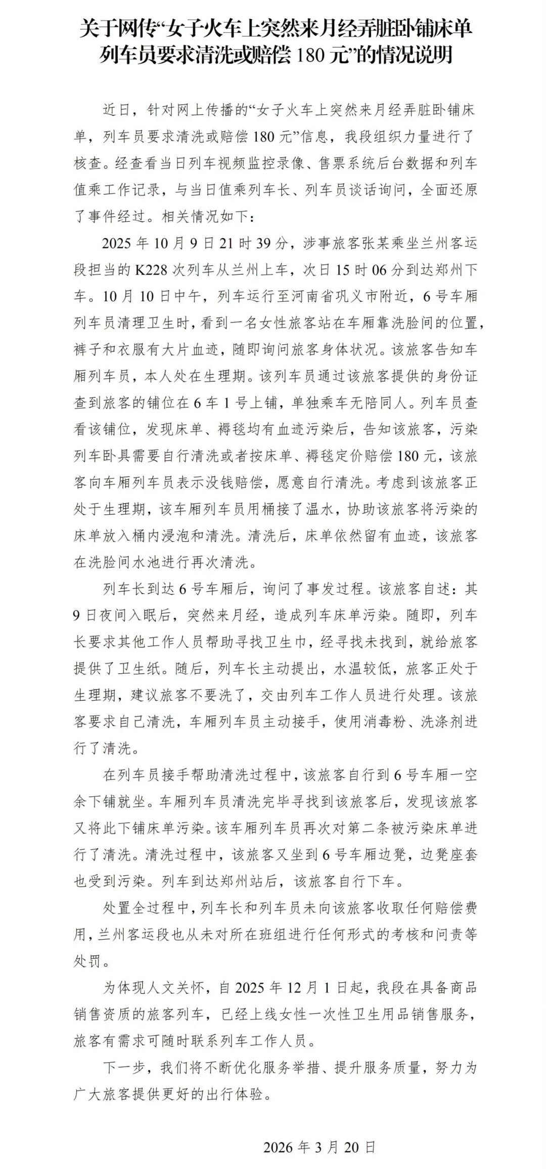 3月20日,“@蘭州客運段”發(fā)布情況說明稱,處置過程中,列車長和列車員未向該旅客收取任何賠償費用,列車員全程協(xié)助,蘭州客運段也從未對所在班組進行任何形式的考核和問責等。此外,自2025年12月1日起,該段在具備商品銷售資質(zhì)的旅客列車,已經(jīng)上線女性一次性衛(wèi)生用品銷售服務。