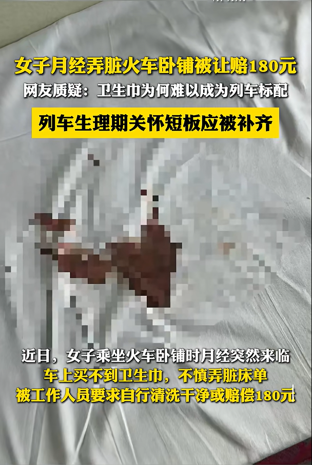 近日,有網(wǎng)民發(fā)帖稱,自己乘坐蘭州鐵路局K228次火車臥鋪時,因月經(jīng)突然來臨,車上買不到衛(wèi)生巾,不慎弄臟臥鋪床單,被工作人員要求自行清洗干凈或賠償180元,同時其在帖文中呼吁火車上應售賣衛(wèi)生巾。此事隨后引發(fā)網(wǎng)民關注。部分網(wǎng)民認為旅客弄臟床單理應賠償,但180元收費標準缺乏依據(jù)、有待規(guī)范考量;部分網(wǎng)民認為長途列車應常態(tài)化配備女性衛(wèi)生用品,保障女性旅客基本出行需求;部分網(wǎng)民借機發(fā)表性別對立言論,偏離事件理性討論軌道。