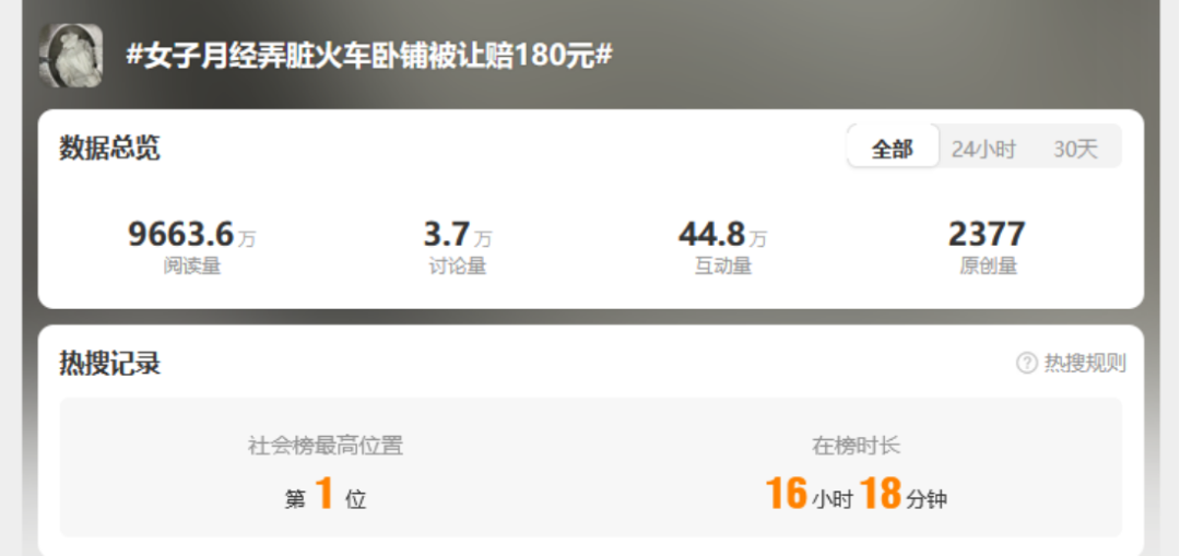 截至3月24日17時,全網(wǎng)相關信息量3.6萬余條,“#女子月經(jīng)弄臟臥鋪被要求賠償180元#”“#火車上的月經(jīng)焦慮該解了#”“#官方通報月經(jīng)弄臟臥鋪事件詳情#”“#女子稱月經(jīng)弄臟臥鋪被事件班組被罰#”等微博話題閱讀量累計超4億。