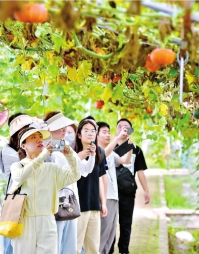 市農(nóng)科院北部園區(qū)新鮮奇特的蔬菜品種繁多,市民代表紛紛拿出手機(jī)拍照。
