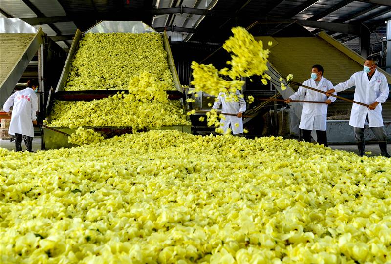9月18日,在安徽省亳州市利辛縣王市鎮(zhèn)高寨村廣焱家庭農(nóng)場(chǎng),村民在整理剛采收的黃蜀葵花。劉勤利攝