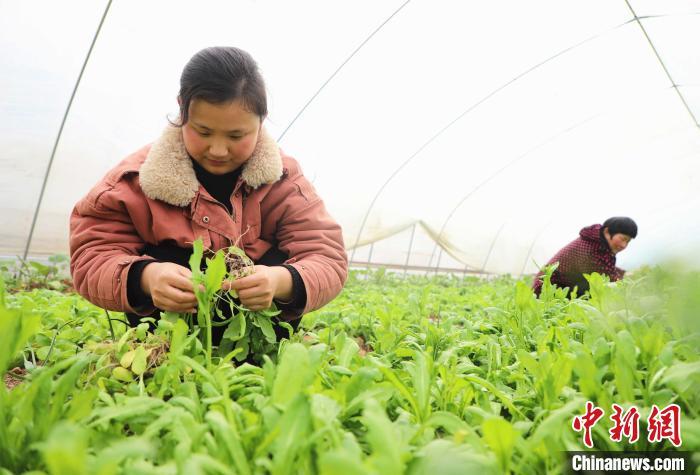 2月14日,安徽省肥西縣紫蓬山旅游開發(fā)區(qū)張老圩村風(fēng)之谷家庭農(nóng)場(chǎng)內(nèi),農(nóng)民在給菜地澆水,采摘、分揀新鮮蔬菜供應(yīng)市場(chǎng),田間地頭一派繁忙景象。