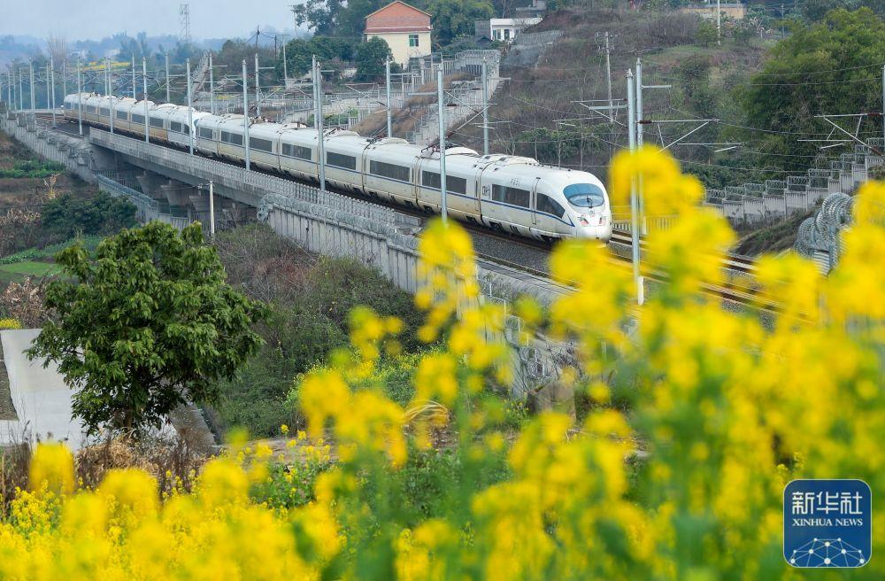 2月27日,動(dòng)車(chē)組列車(chē)行駛在四川省瀘州市龍馬潭區(qū)境內(nèi)。劉學(xué)懿 攝