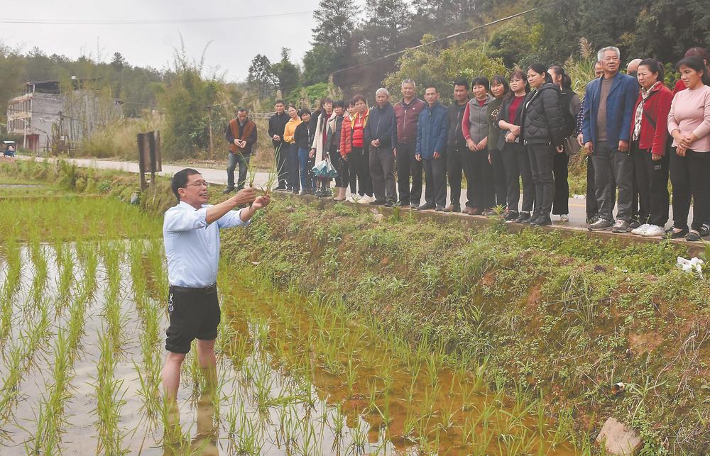 永定區(qū)2023年第七期高素質(zhì)農(nóng)民培訓(xùn)班上,專家在田里講授早稻病蟲(chóng)害防治知識(shí)。