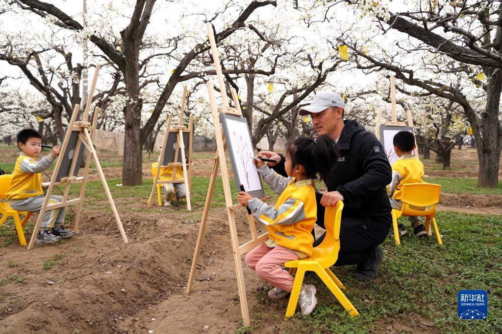 4月2日,老師指導(dǎo)小朋友在臨城縣北程村百年梨園寫生。記者 駱學(xué)峰 攝