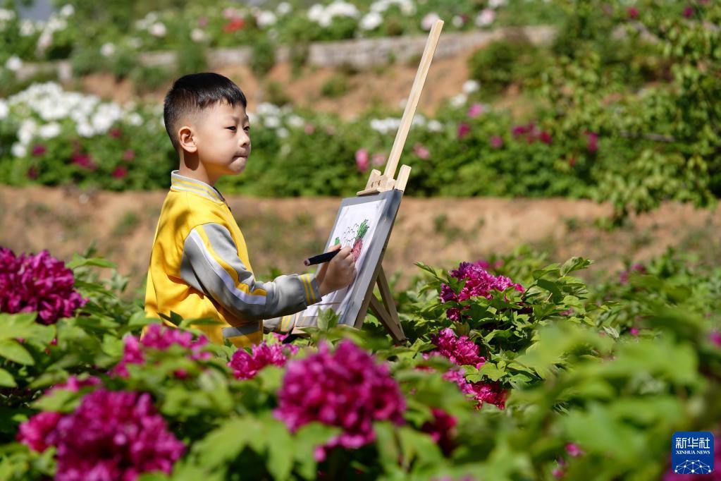 4月16日,小朋友在白臺(tái)峪村牡丹農(nóng)業(yè)產(chǎn)業(yè)園內(nèi)寫生。記者 駱學(xué)峰 攝