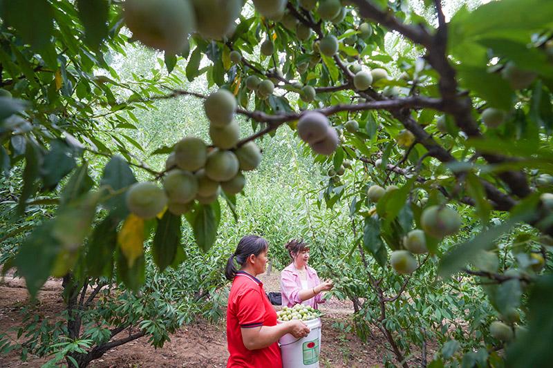 7月6日,山東省鄒平市西董街道南洞村的青李聯(lián)合農場,游客和果農在采摘青李。