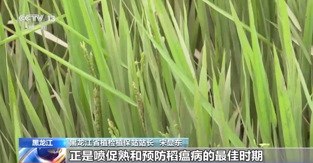 黑龍江省植檢植保站站長宋顯東:像這塊地迫切需要促熟了,正是噴促熟和預(yù)防稻瘟病的最佳時期。上面這幾個功能葉還相當(dāng)不錯,因為水稻產(chǎn)量形成最重要的還是上面那三四個葉。