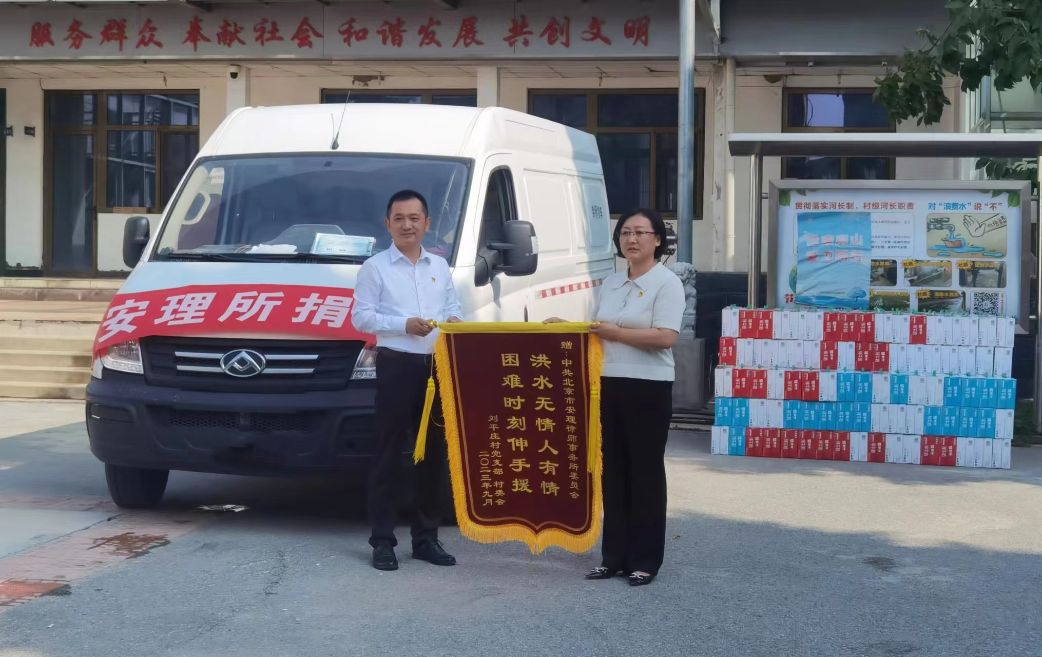 9月1日,中共北京市安理律師事務(wù)所委員會(簡稱“安理黨委”)副書記、管委會委員李學(xué)輝,黨委委員張大軍、楊博,管委會秘書陳琛,黨務(wù)文秘喬雪一行前往北京市房山區(qū)竇店鎮(zhèn)劉平莊村捐物慰問受災(zāi)群眾,助力房山災(zāi)后重建工作。房山區(qū)竇店鎮(zhèn)劉平莊村黨支部書記王春代表村兩委班子接受捐贈。房山區(qū)司法局黨組成員、副局長溫興善,房山區(qū)律師協(xié)會會長黃科,房山區(qū)律師協(xié)會秘書長王恩存一同參加了捐贈活動。