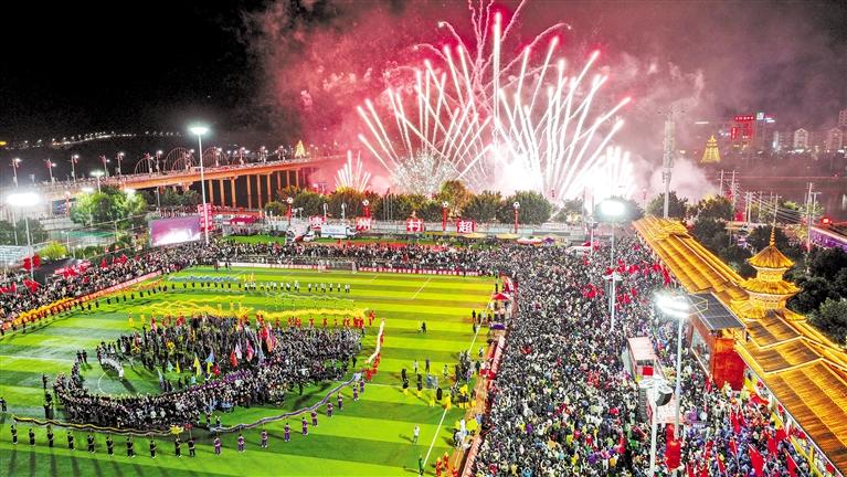 19時30分,澳門職工聯(lián)隊(duì)與貴州村超聯(lián)隊(duì)友誼賽結(jié)束后,“村超村晚”文藝展示又將整場活動推向高潮。這場晚會由民風(fēng)民俗展新顏、鄉(xiāng)村足球超快樂、貴山貴水迎貴客、龍騰盛世慶豐年4個篇章組成,參演演員近2300人。據(jù)相關(guān)負(fù)責(zé)人介紹,此次文藝展示的內(nèi)容均以榕江“村超”自創(chuàng)節(jié)目為主,同時,澳門舞醉龍表演隊(duì)在龍騰盛世慶豐收環(huán)節(jié)與貴州的舞龍隊(duì)伍共同演出,展示出兩地文化的互通互融。本次文藝展示強(qiáng)調(diào)“草根”和民族文化,吸引了上萬人現(xiàn)場觀看,在演出的尾聲,一場持續(xù)10余分鐘的煙花秀點(diǎn)亮了榕江縣的夜空,“文化味、民族味、傳承味、年味”十足的“村超村晚”在觀眾和游客的掌聲與歡呼聲中落下帷幕。