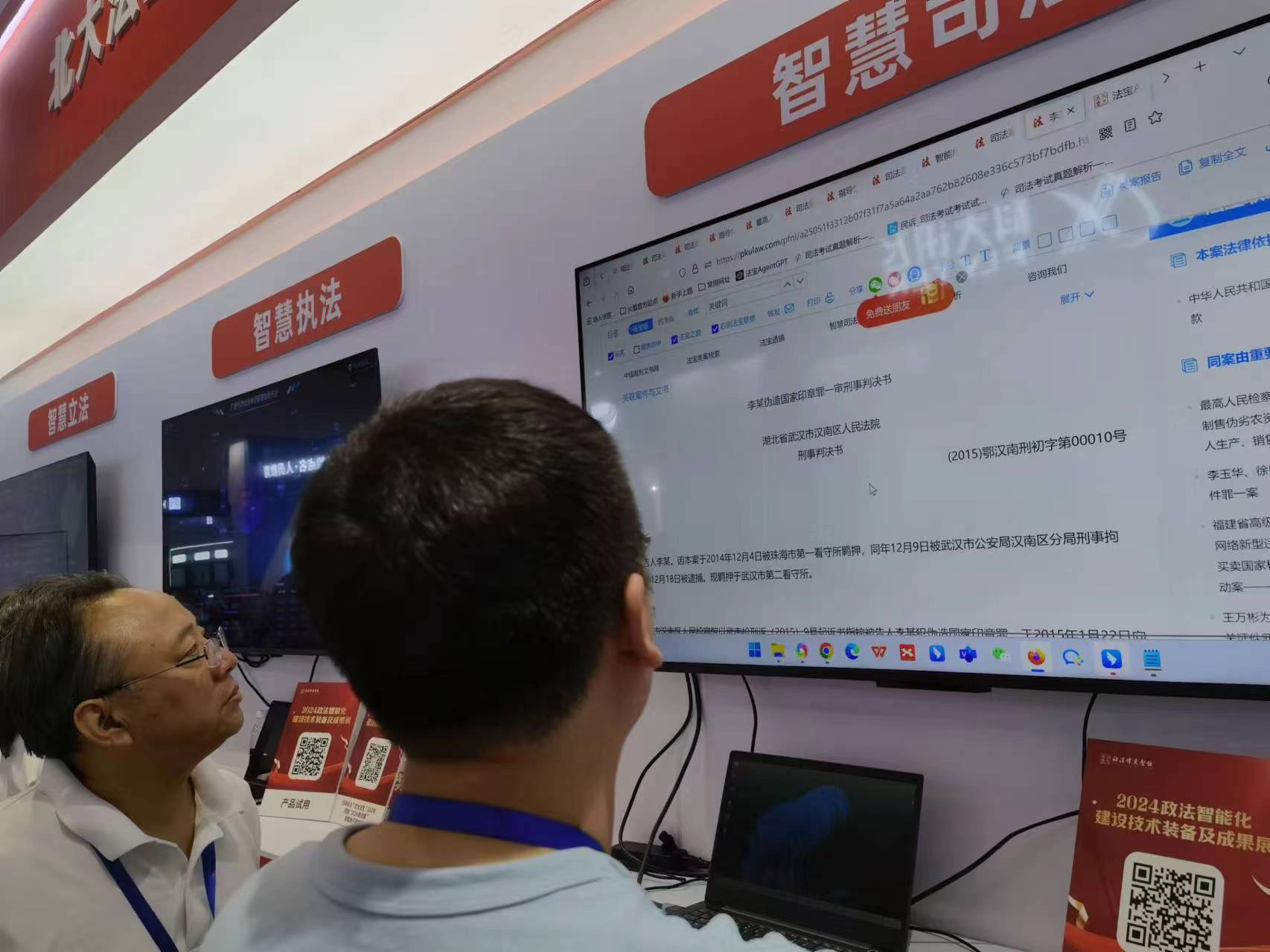 7月10日,記者在北京國家會(huì)議中心參觀由法制日?qǐng)?bào)社主辦的“2024政法智能化建設(shè)技術(shù)裝備及成果展”(以下簡稱“政法裝備展”)時(shí),看到了法律大模型給司法工作帶來高效便捷新賦能的各類演示場景。
